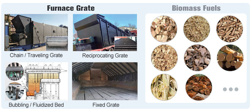 2. Combustion equipment: chain grate/traveling grate, manual type traveling grate, fixed grate, reciprocating grate, bubbling fluidized bed grate