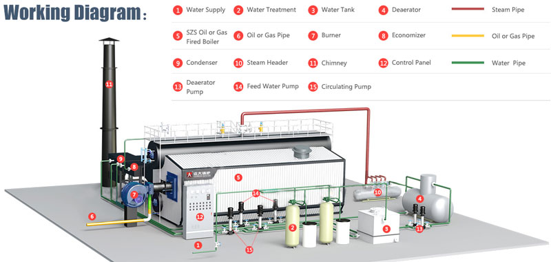 SZS boiler is gas fired(oil fired) boiler with three pass return water tubes, also called fast-assembled water tube boiler. It adopts double-drum "D-type" arrangement, full water membrane wall structure, compound water circulation.